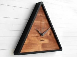 Gambar jam dinding unik ini memperlihatkan jam dinding dengan bentuk segitiga, biasanya jam berbentuk lingkaran atau kotak. Selain itu, jam dinding ini tidak memiliki angka penunjuk sehingga menunjukkan desain minimalis.