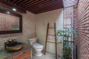 Cara termudah untuk mewujudkan kamar mandi dengan kesan tradisional adalah penggunaan dinding batu bata ekspos. Namun, tingkat kelembapan batu bata sangat tinggi dan mudah sekali meresap air, akibatnya akan mudah berlumut jika terkena cipratan air secara terus menerus.